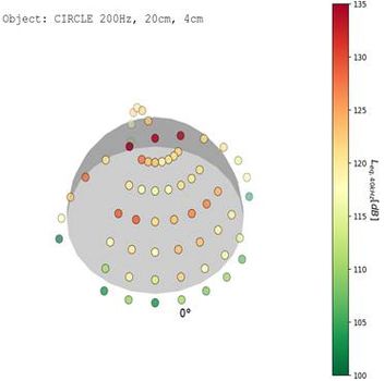 W 2. etapie realizacji projektu przeprowadzono dodatkowe badania hałasu ultradźwiękowego emitowanego przez przetworniki haptyczne. Badania z wykorzystaniem przetwornika STRATOS Inspire przeprowadzono w wybranych punktach półsfery o promieniu 0,5 m, skupiając się głównie na kierunku przednim przetwornika (kierunku, w którym powinien znajdować się użytkownik przetwornika). Wyniki pomiarów (rysunek poniżej) dla różnych obiektów dotykowych wskazały, że niemal we wszystkich punktach pomiarowych wartość równoważnego poziomu ciśnienia akustycznego w paśmie tercjowym o częstotliwości środkowej 40 kHz przekraczała 110 dB. W kilku punktach pomiarowych, a w szczególności w punkcie bezpośrednio nad generowanym obiektem poziom ciśnienia akustycznego przekraczał 130 dB. Wyniki badań wskazują, że długotrwałe lub niewłaściwe korzystanie z ultradźwiękowego przetwornika haptycznego (tzn. z głową zbyt blisko przetwornika) może prowadzić do przekroczenia wartości dopuszczalnych hałasu ultradźwiękowego w środowisku pracy.