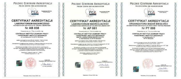 Dzięki posiadanej akredytacji laboratoria aktywnie uczestniczą w procesach oceny zgodności wykonując badania wyrobów i parametrów środowiska pracy oraz wzorcowania wyposażenia pomiarowego i badawczego. Poprzez wszystkie działania, laboratoria badawcze i wzorcujące Instytutu dostarczają wiarygodne wyniki badań i wzorcowań, co przekłada się na działania istotne dla poprawy w zakresie ochrony zdrowia i życia człowieka w środowisku pracy.