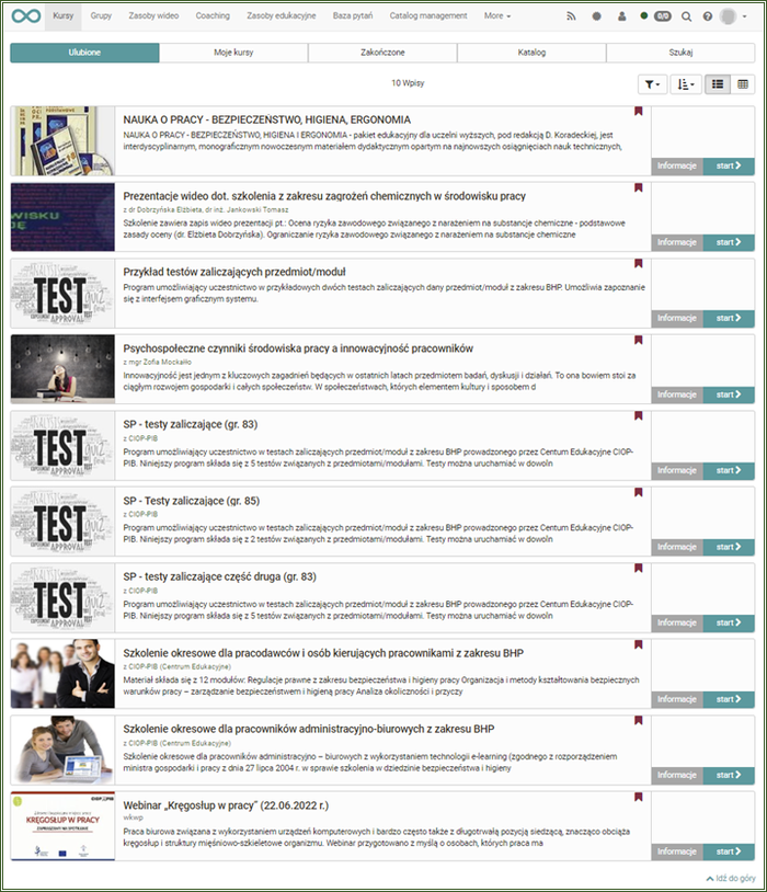 Zadanie 4.SP.04. Widok ekranu przeglądarki internetowej prezentujący dostępne materiały edukacyjne z zakresu bezpieczeństwa i higieny pracy zamieszczone na platformie edukacji zdalnej Open OLAT