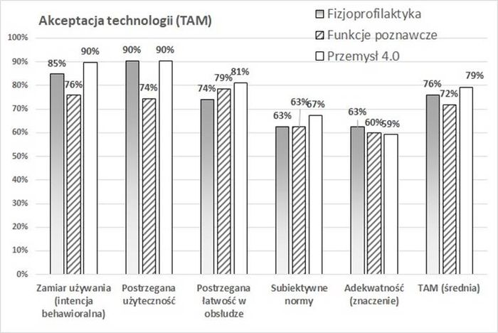 Projekt IV.PB.07. Kwestionariusz służący do pomiaru poziomu akceptacji technologii (TAM – Technology Acceptance Model); na wykresie przedstawiono uzyskany wynik jako procent wartości maksymalnej możliwej do uzyskania