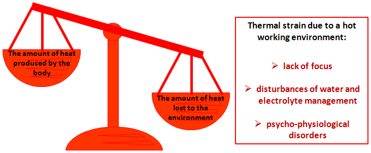 When the worker is exposed to the hot environment, there is a decline in work efficiency and the accuracy of task performance, water and electrolyte disturbances and psycho-physiological disorders [in Polish: Gwódź B. Człowiek w środowisku wielkoprzemysłowym i elementy ergonomii. in: Fizjologia człowieka z elementami fizjologii stosowanej i klinicznej. Wydawnictwo Lekarskie PZWL, Warszawa, 2001] (Fig. 6).