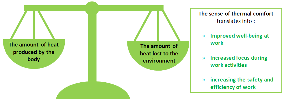 In a thermoneutral environment, thermal comfort is felt and hence the amount of heat that is produced by the body is dispersed so that the temperature of the body, without the involvement of an independent thermoregulatory mechanism, remains constant. The sense of thermal comfort translates into, inter alia: better well-being at work or increased concentration during activities (Figure 4).
