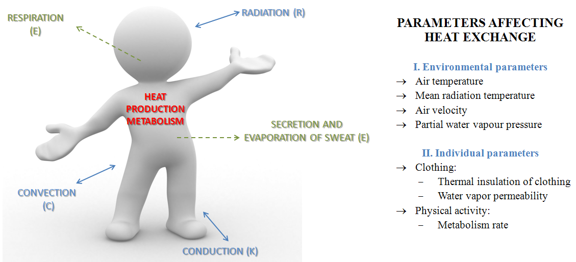 The heat produced by the human body is the result of metabolic processes taking place in the body. The heat exchange between a person and the environment takes place through: conduction, convection, radiation and evaporation (water evaporate from the body, both through sweating and exhaling of air) (Fig. 2). The contribution of these phenomena in the heat transfer process depends, from the parameters of the environment in which the person is located (environmental factors), inter alia: temperature and air velocity, mean radiation temperature, partial water vapour pressure as well as individual factors such as: physical activity or protective clothing used [inPolish: Bogdan, A .; Zwolińska, M .; Wpływ odzieży na wymianę ciepła między człowiekiem a otoczeniem; Ciepłownictwo, Ogrzewnictwo, Wentylacja; 1/2010; 27-31]