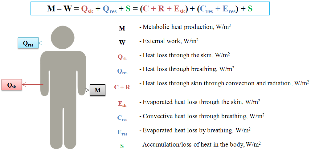 Heat transfer processes between human and environment are described by the thermal balance equation (Figure 3) [ASHRAE Handbook – HVAC Systems and Equipment. American Society of Heating, Refrigerating, and Air Conditioning Engineers, Inc., Atlanta.1996; in Polish: Fanger P. O., Komfort cieplny, Wyd. Arkady, Warszawa, 1974].
