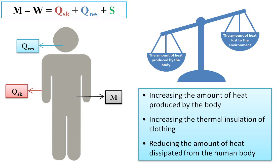 In order to reduce the heat load in a cold environment, one should strive to balance the heat balance (aim at S = 0). This condition can be achieved by, among others increasing the amount of heat produced by the body, increasing the thermal insulation of clothing and reducing the amount of heat received from the human body by the external environment (e.g. reducing the air flow).