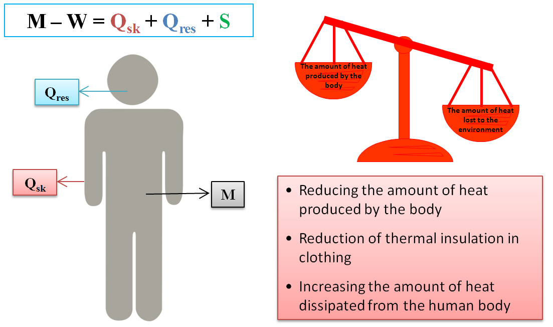 In order to reduce the heat strain in a hot environment, the same should be done to balance the heat balance (aim for S = 0). This condition can be achieved by, among others reducing the amount of heat produced by the body (e.g. reducing the load of work), reducing the thermal insulation of clothing (improving heat exchange with the environment) and increasing the amount of heat received from the human body by the external environment (e.g. increasing the air flow).