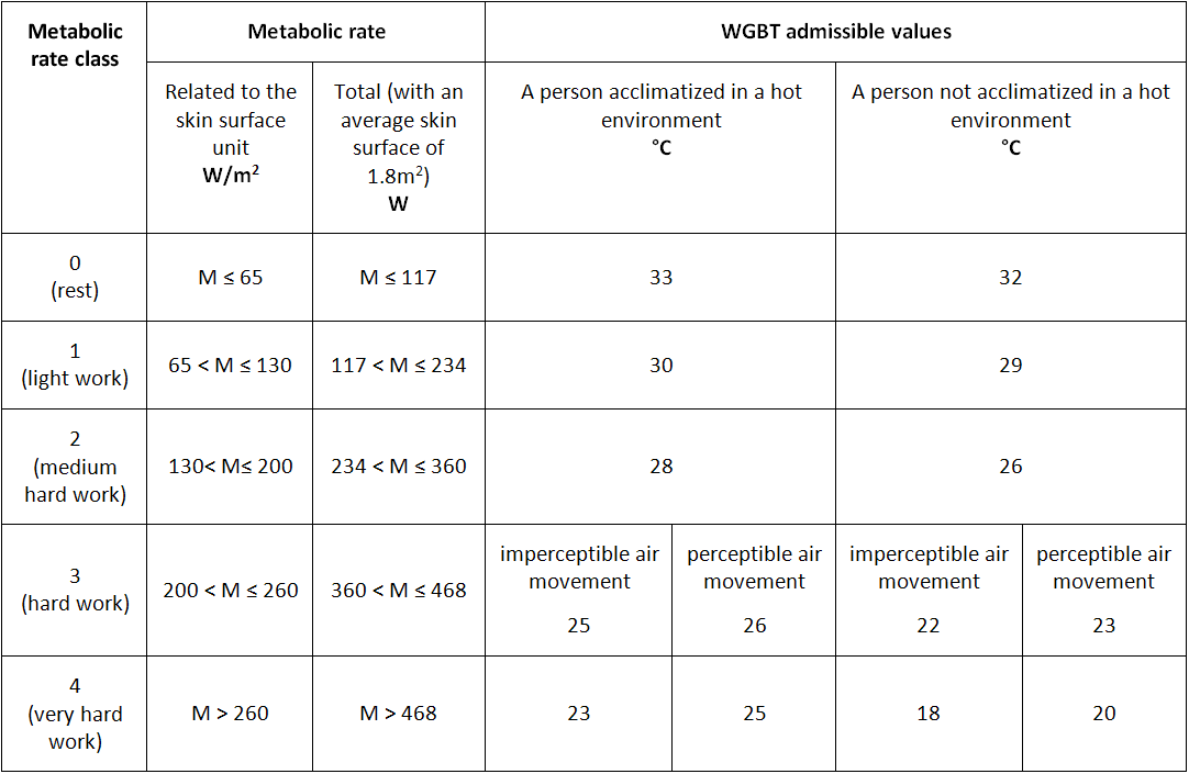 Table 1. Admissible WBGT values, which can not be exceeded within the 8-hour daily working time [Regulation of the Minister of Family, Labor and Social Policy of 12 June 2018 on the highest allowable concentrations and intensities of factors harmful to health in the work environment. Journal of Laws 2018 item 12866]