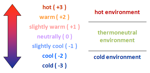 After the assessment or measurement of the above factors, it is possible to predict human thermal sensations, expressed in a 7-point scale of thermal sensations, as: hot (+3), warm (+2), slightly warm (+1), neutral (0), slightly cool (-1), cool (-2), cold (-3) by calculating the PMV and PPD indexes. [Fanger PO: Thermal comfort. Warsaw, Arkady 1974; ASHRAE Handbook - HVAC Systems and Equipment. American Society of Heating, Refrigerating, and Air Conditioning Engineers, Inc., Atlanta 1996]