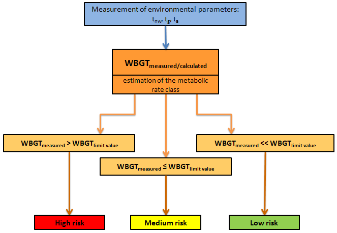 Occupational risk assessment in a hot environment is defined by means of the WBGT index (Figure 4) [in Polish: Sołtyński, K., Marszałek, A., Obciążenia termiczny W: Ryzyko zawodowe Metodyczne podstawy oceny, pod red. M.W. Zawieska, Warszawa 2007, CIOP-PIB].