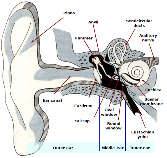 The inner ear consists of three semicircular canals that decide about the sense of balance and a spirally twisted channel called the cochlea which contains sensory cells sensitive to sound. The cochlea is filled with liquid and is divided into two parts by the basal membrane. The vibrations of the stapes transmitted through the oval window located in the base of the screw cause the liquid to move, which presses the basilar membrane. On the basilar membrane there is the Organ of Corti with rows of hair cells arranged in rows with hair-like structures called stereocilia. When the basal membrane is set in motion by vibrations of the liquid filling the cochlea, the stereocilia are bent and the auditory nerve is thereby stimulated. The nerve impulses produced in this way are interpreted as sound.
