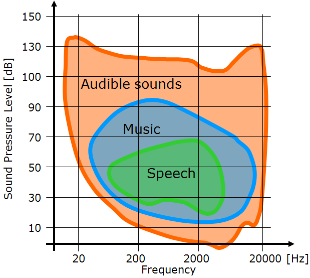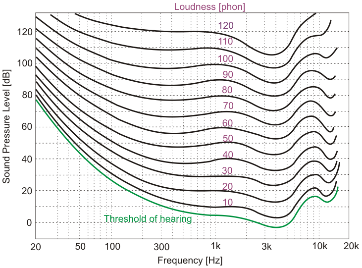The auditory sensation due to sound depends on its frequency and sound pressure level. Fig. 6 shows a typical range of sounds heard by people with normal hearing. The lowest curve corresponds to the quietest sounds a human can hear, hence the so-called hearing threshold. The highest curve corresponds to the sounds that cause pain (the so-called pain threshold).