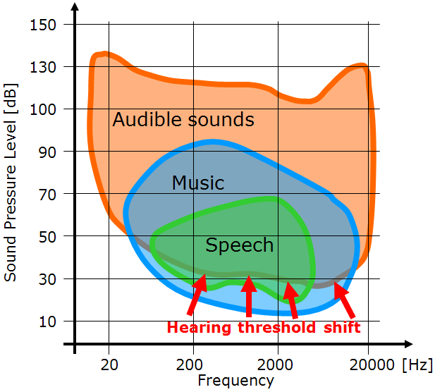 The basic consequence of the hearing threshold shift is the deterioration of speech intelligibility. Fig. 7 and Fig. 8 schematically show the ranges of sounds corresponding to a typical music signal and speech and range of audible sounds for person with normal hearing (Fig. 7) and damaged (Fig. 8). The shift of the hearing threshold (Figure 8) causes that part of the speech signal (in the range of higher frequencies), important for high speech intelligibility, is beyond the area of audible sounds. Other consequences of hearing loss include problems in assessing the volume of sounds, loss of ability to distinguish sound pitch, and limiting the ability to directional hearing.