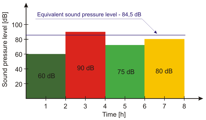 The employee's exposure to ultrasonic noise can vary over the course of an 8-hour working day. In such a case, in order to determine the risk of ultrasonic noise for the worker during the shift, the equivalent level of sound pressure should be used. Equivalent sound pressure level is the sound pressure level of a noise which, while operating for the same duration as noise with varying sound pressure levels, carries the same acoustic energy and the same risk of hearing impairment. Fig. 2 shows an example of changes in the sound pressure levels of ultrasonic noise during an 8-hour working day. The employee worked for the first two hours in a noise with a sound pressure level of 60 dB, the next two hours in a noise with a sound pressure level of 90 dB, then two hours in a noise with a sound pressure of 75 dB and two hours in a noise with a sound pressure level of 75 dB. From an occupational exposure point of view, this corresponds to a situation where a worker would work eight hours in a noise with a sound pressure level of 84.5 dB.