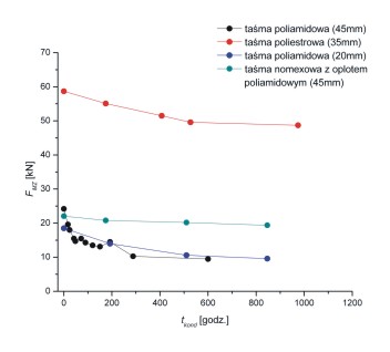 W konsekwencji tego opracowano metodę przyspieszonego starzenia elementów włókienniczych uprzęży opierającą się na naświetlaniu za pomocą urządzenia z lampą XBO-450W/4. W wyniku przeprowadzonych badań ustalono przelicznik między czasem naświetlania za pomocą urządzenia i czasem użytkowania uprzęży. Przykład obniżenia wytrzymałości taśm włókienniczych pod wpływem naświetlania przedstawiono na rys.1