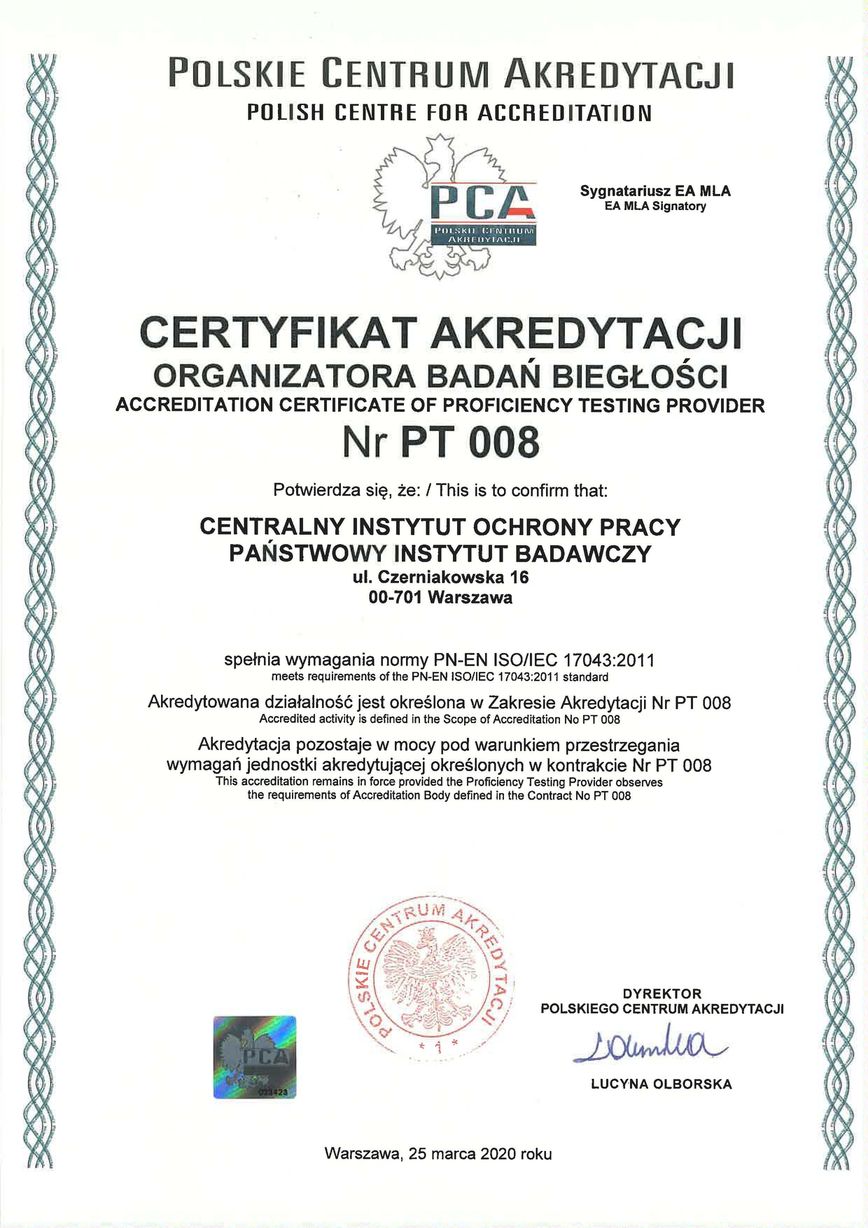 Posiadamy wdrożony oraz akredytowany przez PCA system zarządzania zgodny z wymaganiami normy PN-EN ISO/IEC 17043:2011. Obecnie jesteśmy w trakcie wdrażania wymagań PN-EN ISO/IEC 17043:2023-10.