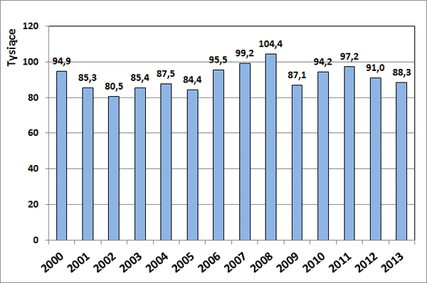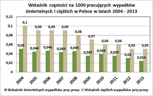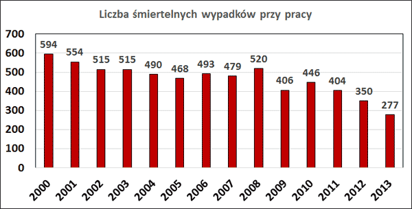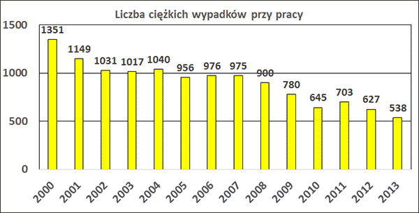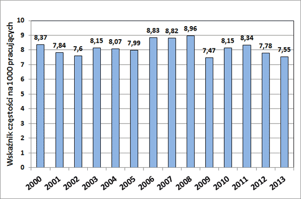 Analiza danych Głównego Urzędu Statystycznego wykazuje, że w latach 2000-2013 liczba wypadków przy pracy (rys. 1) i wskaźnik częstości (rys. 2) nie uległy zasadniczym zmianom. Po krótkoterminowych okresach spadku w latach 2002, 2005 i 2009 następował ponowny wzrost liczby i wskaźnika wypadków. W roku 2012 odnotowano powrót do tendencji spadkowej, zarejestrowano 91 tys. wypadków przy pracy, czyli tyle ile wynosi średnia z okresu od roku 2000 do 2012. Zgodnie z tą tendencją w roku 2013 liczba wypadków zmniejszyła się do 88.3 tys.