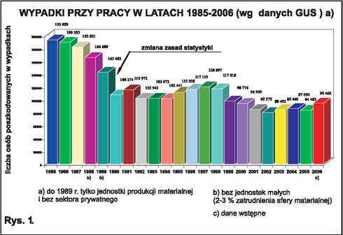 Podstawowe wskaźniki, charakteryzujące stan bhp w 2006 r., nie budzą optymizmu. W porównaniu z rokiem 2005 wzrosła liczba poszkodowanych w wypadkach (o 13,1%), liczba wypadków ciężkich (ciężkich 2,8%) i śmiertelnych (śmiertelnych 4,9%) oraz ogólny wskaźnik częstotliwości wypadków przy pracy (z 7,99 do 8,87), a coraz więcej osób pracuje w warunkach szkodliwych i uciążliwych. Zmalała jedynie liczba stwierdzonych przypadków chorób zawodowych (o 3,7%).