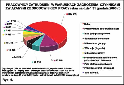 Liczba osób zatrudnionych w warunkach zagrożenia czynnikami związanymi ze środowiskiem pracy, czyli przekroczenia NDS i NDN, zmniejszyła się z 339,3 tys. w 2005 r. do 338,1 tys. w 2006 r., w tym kobiet – z 53,1 tys. do 49,4 tys. (rys. 4.). W 2006 r. zlikwidowano lub ograniczono 150,4 tys. osobozagrożen (liczba osób liczonych tyle razy, na ile czynników szkodliwych są narażone) związanych z czynnikami środowiska pracy. Równocześnie stwierdzono 84,1 tys. nowo powstałych lub nowo ujawnionych osobo zagrożeń.