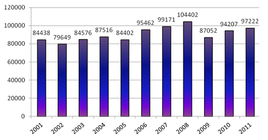 W roku 2011 zarejestrowano ponad 97 tys. wypadków przy pracy (rys.1).