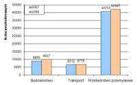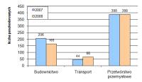 Rys. 1. Poszkodowani w wypadkach przy pracy ogółem w budownictwie, transporcie i przetwórstwie przemysłowym, w latach 2007 – 2008.