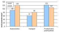 Rys. 4. Średnia absencja na 1 poszkodowanego w wypadkach przy pracy w budownictwie, transporcie i przetwórstwie przemysłowym, w latach 2007 – 2008.