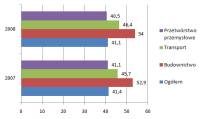 Liczbę wypadków przy pracy ogółem w budownictwie, transporcie i przetwórstwie przemysłowym w latach 2007 – 2008 obrazuje rys.1, liczbę wypadków ciężkich rys.2, zaś liczbę wypadków śmiertelnych rys.3.