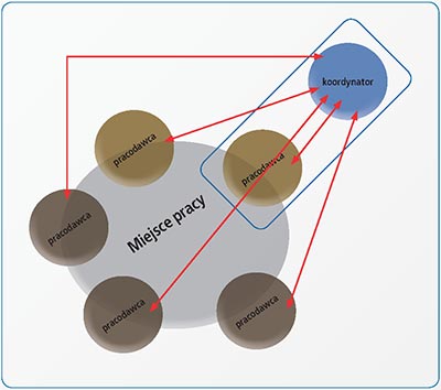 Obok wymogu współpracy wszystkich pracodawców, ustawodawca nakłada obowiązek wyłonienia koordynatora (rys.), który sprawo-wać ma nadzór nad wszystkimi pracownikami bez względu na to, u jakiego pracodawcy są zatrudnieni (art. 208 § 1 pkt 2 kp). Praca wykonywana zbiorowo wymaga jednolitego ukierunkowania zadań zapewniających dobrą organizację pracy. Również w zakresie bhp zapewnienie jednolitego nadzoru ma być gwarantem pełnego respektowania przepisów i zasad bhp.