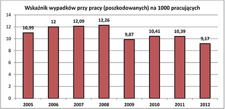 W budownictwo rokrocznie występuje bardzo duża liczba wypadków. Wg danych GUS za 2012 r. wskaźnik ich częstości wyniósł 9,17 na 1000 pracujących, a więc, mimo spadku w stosunku do poprzednich lat, nadal jest bardzo wysoki, przez co sektor budownictwa ciągle znajduje się w czołówce tej statystyki (rys.).