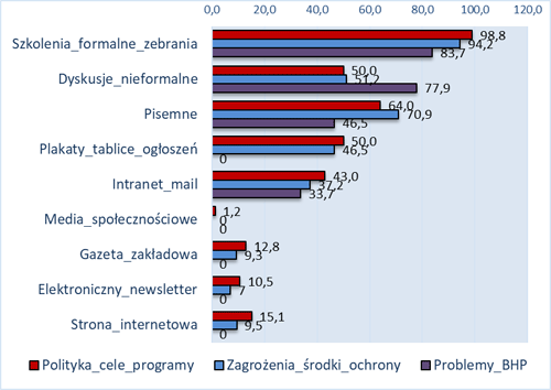 Dyskusje nieformalne są najczęściej postrzegane jako metoda służąca pozyskiwaniu informacji o problemach BHP od pracowników – dotyczy to niemal 80% badanych przedsiębiorstw. Z kolei pisemne metody komunikowania się są najczęściej (w ponad 70% badanych przedsiębiorstw) wykorzystywane do przekazywania informacji o zagrożeniach i środkach ochrony.