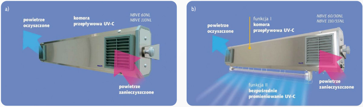 Zamiast bezpośredniego naświetlania powierzchni możliwe jest rozwiązanie bezpieczniejsze, polegające na zastosowaniu opraw bakteriobójczych z funkcją wymuszonego przepływu powietrza. W tych oprawach dezynfekcja powietrza odbywa się w zamkniętej obudowie - komorze uniemożliwiającej przenikanie promieniowania UVC na zewnątrz oprawy, dzięki czemu podczas procesu dezynfekcji nie występuje narażenie osób przebywających w pomieszczeniu na promieniowanie uVc. Tego typu oprawy występują w dwóch podstawowych wariantach: jednofunkcyjnym - tylko przepływowa dezynfekcja powietrza (rys. 1a) lub dwufunkcyjnym - z dodatkową funkcją dezynfekcji bezpośredniej, tzn. z dodatkowymi promiennikami UVC zamontowanymi na zewnątrz oprawy (rys. 1b).