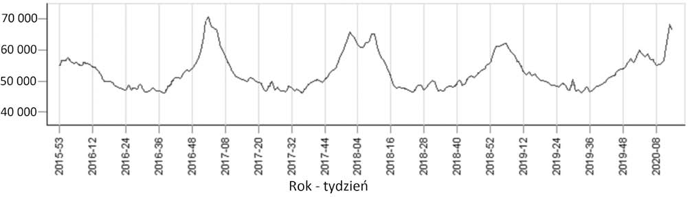 Rys. 1. Dzienna Liczba zgonów w Europie w zależności od tygodnia roku.