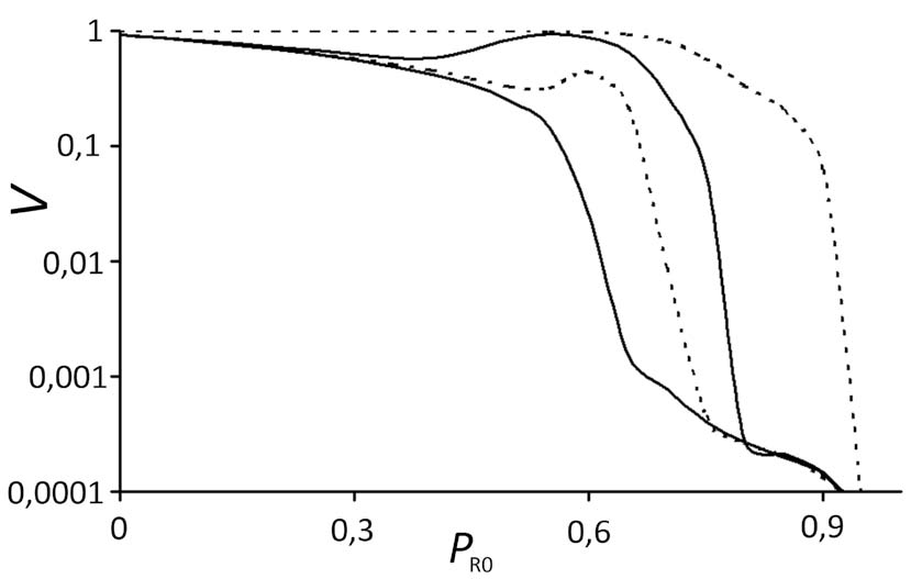 Rys. 2. Względna liczba osób zainfekowanych (V) w zależności od odsetka liczby osób odpornych (PR0) dla patogenów o różnym prawdopodobieństwie mutacji. Dla wirusów szczególnie łatwo mutujących (np. wirus grypy) skuteczne zaszczepienie nawet prawie całej populacji (>90%) nie powoduje zatrzymania epidemii.