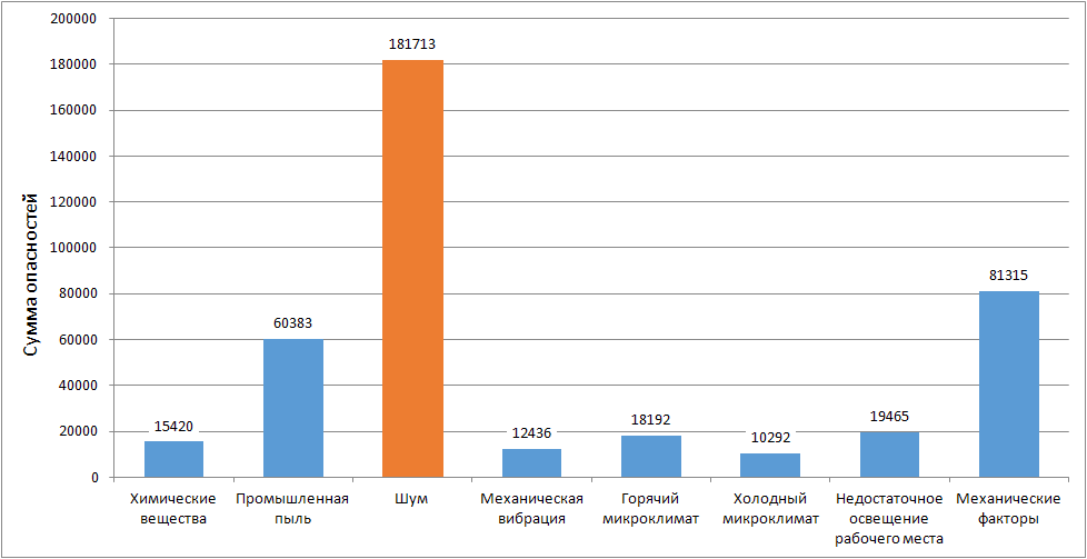Диаграмма на Рис. 1 изображает опасность шума на фоне опасностей другими вредными и обременительными факторами рабочей среды. Из представленных диаграмм видно, что число работников, подверженных шуму в рабочей среде, намного больше, чем подверженных опасностям других факторов.
