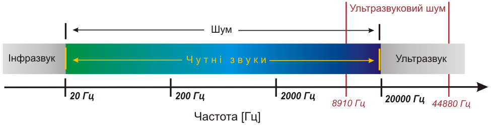 Ультразвуковий шум визначається як шум, звуки з високими звуковими і низькими ультразвуковими частотами (або інакше: в спектрі яких зустрічаються звуки з такими частотами) - від 10 кГц до 40 кГц. Частоти, наведені у визначенні, відносяться до частот діапазонів середньої терційних смуг (див. далі), що означає, що ультразвуковий шум включає звуки з частотами від 8,91 кГц до 44,88 кГц. Діапазон ультразвукового шуму за шкалою частот звуку показаний на Рис.1.