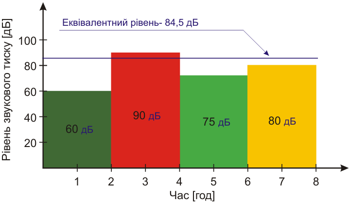 Вплив ультразвукового шуму на працівника може змінюватися протягом 8-годинного робочого дня. У цьому випадку для визначення ризиків, пов'язаних з впливом ультразвукового шуму, працівникові слід використовувати еквівалентний рівень звукового тиску. Еквівалентний рівень звукового тиску це рівень звукового тиску такого шуму, який, діючи протягом того ж часу, що і шум зі змінним рівнем звукового тиску, несе в собі ту ж акустичну енергію і той же ризик пошкодження слуху. На Рис. 2 наведено приклад зміни рівня звукового тиску ультразвукового шуму протягом 8-годинного робочого дня. Перші дві години працівник працював в шумі з рівнем звукового тиску 60 дБ, наступні дві години в шумі з рівнем звукового тиску 90 дБ, потім дві години в шумі зі звуковим тиском 75 дБ і дві години в шумі з рівнем звукового тиску 75 дБ. З точки зору професійного впливу це відповідає ситуації, коли працівник буде працювати вісім годин в шумі з рівнем звукового тиску 84,5 дБ.
