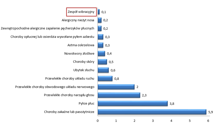 Na wykresach z rys. 7 i rys. 8 opracowanych na podstawie danych opublikowanych przez IMP pokazano liczbę przypadków stwierdzonych w Polsce w 2019 r. chorób zawodowych w liczbach bezwzględnych i w przeliczeniu na 100 tys. pracujących (tzw. współczynnik zachorowalności). Prezentowane dane ograniczono do chorób o największej zapadalności. Z przedstawionych danych wynika, że w 2019 r. stwierdzono 9 przypadków zespołu wibracyjnego, co odpowiadało współczynnikowi zachorowalności równemu 0,1.