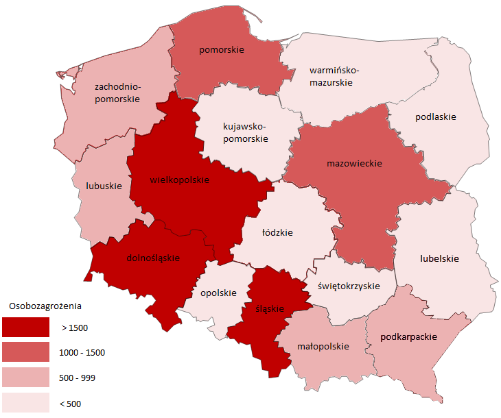 Wykres na rys. 5 pokazuje zagrożenie drganiami mechanicznymi środowisku pracy w poszczególnych województwach. Największą liczbę zagrożonych tym czynnikiem odnotowano w 2019 r. w województwach: śląskim (2295 zagrożonych), dolnośląskim (1988) i wielkopolskim (1575), czyli w województwach o znacznej koncentracji zakładów z sekcji przetwórstwa przemysłowego, górnictwa.