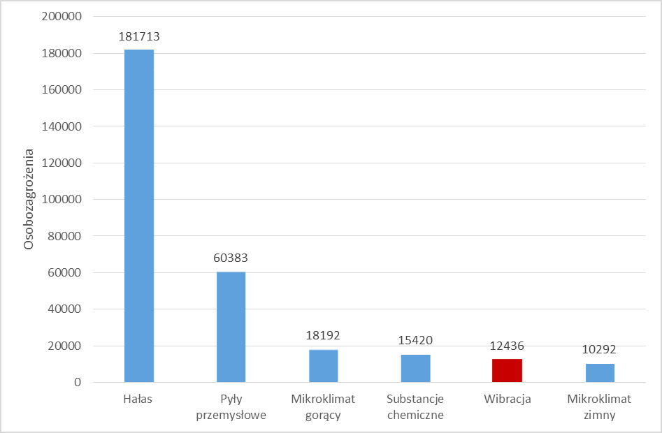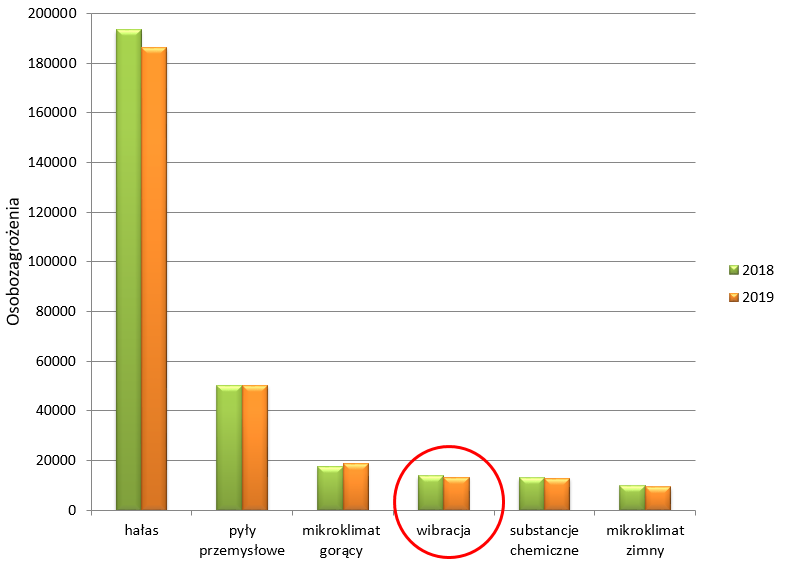 Zaprezentowane dane statystyczne obrazujące stan zagrożenia drganiami mechanicznymi w środowisku pracy w Polsce opracowano na podstawie danych publikowanych przez Główny Urząd Statystyczny ("Warunki pracy w 2020 r.", Warszawa 2021 r.) oraz przez Instytut Medycyny Pracy im. prof. J. Nofera (”Choroby zawodowe w Polsce w 2019 r.”, Łódź 2020) Stosowane w opisach określenie osobozagrożenia to suma działających na pracownika, szkodliwych czynników (np. jeśli pracownik narażony jest jednocześnie na drgania mechaniczne, hałas i substancje chemiczne to mamy do czynienia z trzema osobozagrożeniami). Jeżeli na każdego pracownika działa tylko jeden czynnik szkodliwy, wówczas suma osobozagrożeń równa jest liczbie osób narażonych na czynniki szkodliwe.