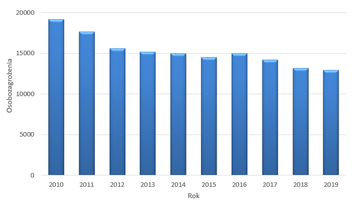 Drgania mechaniczne (wibracje) sąpiątym pod względem liczby zagrożonych pracowników czynnikiem szkodliwym środowiska pracy (wykresy na rys. 1 i rys. 2). W 2020 roku na drgania mechaniczne było narażonych 12436 pracowników. Wg danych GUS, w porównaniu do roku 2019 liczba pracowników zagrożonych drganiami mechanicznymi utrzymuje się na podobnym poziomie (rys. 3), jednak w dłuższym okresie czasu można zauważyć tendencję malejącą (rys. 4).