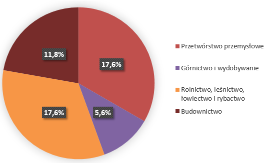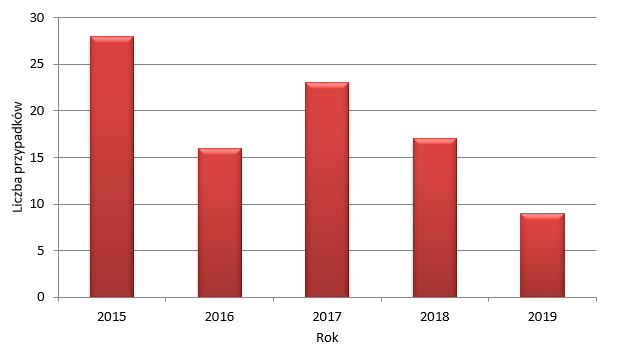 Na Rys. 9 przedstawiono dane dotyczące stwierdzonych przypadków zespołu wibracyjnego w 2019r. w sekcjach gospodarki narodowej, w których odnotowano największe zagrożenie drganiami mechanicznymi. Najwięcej przypadków tej choroby stwierdza się w sekcjach rolnictwa, leśnictwa, łowiectwa i rybactwa (3), przetwórstwa przemysłowego (3), górnictwa i wydobywania (1) oraz budownictwa (2). Są to sekcje, w których powszechnie wykorzystywane są różnego rodzaju pneumatyczne, hydrauliczne, elektryczne i spalinowe narzędzia ręczne takie jak młoty pneumatyczne, wiertarki (w tym udarowe), szlifierki, ubijaki udarowe i piły łańcuchowe.