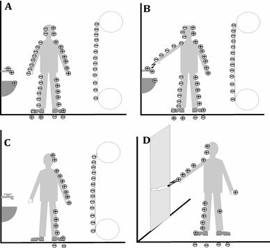 Elektryzowanie ciała człowieka odizolowanego od ziemi, eksponowanego na pole (elektryzowanie przez indukcję). A – człowiek odizolowany, eksponowany na pole, pole wytwarzane jest przez naelektryzowany obiekt, B – człowiek zbliża się do obiektu naelektryzowanego, powodując wyładowanie ES, C – w wyniku wyładowania człowiek w rzeczywistości został naelektryzowany, D – po wyjściu z pola człowiek może spowodować kolejne wyładowanie, tym razem rozładowujące go.