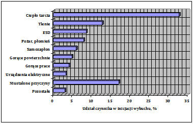 Udział poszczególnych czynników inicjujących wybuchy pyłów, wg BIA-Report 11/97