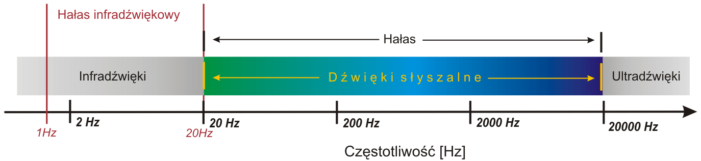 Hałas infradźwiękowy definiowany jest jako hałas obejmyjący dźwięki o częstotliwościach od 1 Hz do 20 Hz. Zakres hałasu ultradźwiękowego na skali częstotliwości dźwięków przedstawiono na Rys. 1.