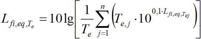 W przypadku, gdy narażenie na hałas ultradźwiękowy w ciągi dnia pracy można podzielić na n wyraźnie rozróżnialnych przedziałów czasu Tej, o zróżnicowanych warunkach narażenia na hałas ultradźwiękowy, to równoważny poziom ciśnienia akustycznego w i-tym paśmie częstotliwości dla łącznego czasu ekspozycji Te można wyznaczyć z zależności: