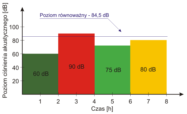 Narażenie na hałas ultradźwiękowy pracownika może zmieniać się w ciągu 8-godzinnego dnia pracy. W takim przypadku aby określić jakie ryzyko niesie ze sobą dla pracownika oddziałujący na niego w ciągu zmiany hałas ultradźwiękowy należy posłużyć się równoważnym poziomem ciśnienia akustycznego. Równoważny poziom ciśnienia akustycznego jest to poziom ciśnienia akustycznego takiego hałasu, który działając przez taki sam czas jak hałas o zmiennym poziomie ciśnienia akustycznego, niesie ze sobą taką samą energię akustyczną i takie samo ryzyko uszkodzenia słuchu. Na Rys. 2 przedstawiono przykład zmian poziomów ciśnienia akustycznego hałasu ultradźwiękowego w ciągu 8-godzinnego dnia pracy. Pracownik pierwsze dwie godziny pracował w hałasie o poziomie ciśnienia akustycznego równym 60 dB, następne dwie godziny w hałasie o poziomie ciśnienia akustycznego równym 90 dB, następnie dwie godziny w hałasie o ciśnienia akustycznego równym 75 dB i dwie godziny w hałasie o poziomie ciśnienia akustycznego równym 75 dB. Z punktu widzenia narażenia zawodowego odpowiada to sytuacji, w której pracownik pracowałby osiem godzin w hałasie o poziomie ciśnienia akustycznego równym 84,5 dB.