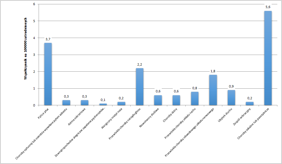 Rys. 10. Dominujące choroby zawodowe w Polsce w 2019 r. - liczba stwierdzonych przypadków w przeliczeniu na 100 tys. zatrudnionych (współczynnik zachorowalności).