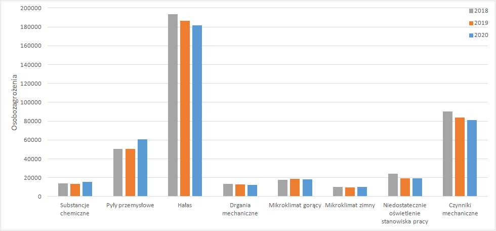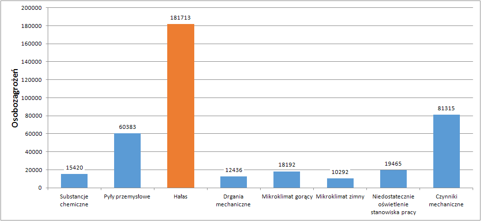 Hałas jest najpowszechniej występującym czynnikiem szkodliwym środowiska pracy. Według danych Głównego Urzędu Statystycznego w 2020 r. w warunkach zagrożenia hałasem pracowało 181,7 tys. osób co stanowiło więcej niż 45,5% ogólnej liczby pracowników zatrudnionych w warunkach zagrożenia czynnikami szkodliwymi środowiska pracy. Poniżej przedstawiono w formie graficznej dane statystyczne obrazujące stan zagrożenia hałasem w środowisku pracy w Polsce, opracowane na podstawie danych publikowanych przez Główny Urząd Statystyczny w latach 2019 – 2021 w ramach serii „Warunki pracy”. Stosowane w opisach wykresów osobozagrożenia to suma działających na pracownika, szkodliwych czynników (np. jeśli pracownik narażony jest jednocześnie na hałas, substancje chemiczne i mikroklimat gorący to mamy do czynienia z trzema osobozagrożeniami). Jeżeli na każdego pracownika działa tylko jeden czynnik szkodliwy, wówczas suma osobozagrożeń równa jest liczbie osób narażonych na czynniki szkodliwe.