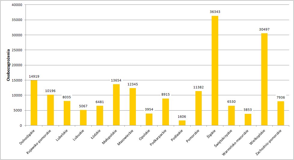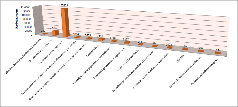 Z przedstawionych danych statystycznych wynika, że najwięcej osób zagrożonych hałasem pracowało w sekcjach: przetwórstwa przemysłowego (137433 zagrożonych), górnictwa (22059) i budownictwa (7649).