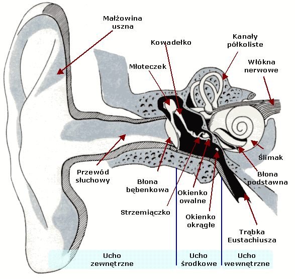 Ucho ludzkie, którego budowę pokazano na Rys. 4 można podzielić na trzy części: ucho zewnętrzne, ucho środkowe i ucho wewnętrzne.