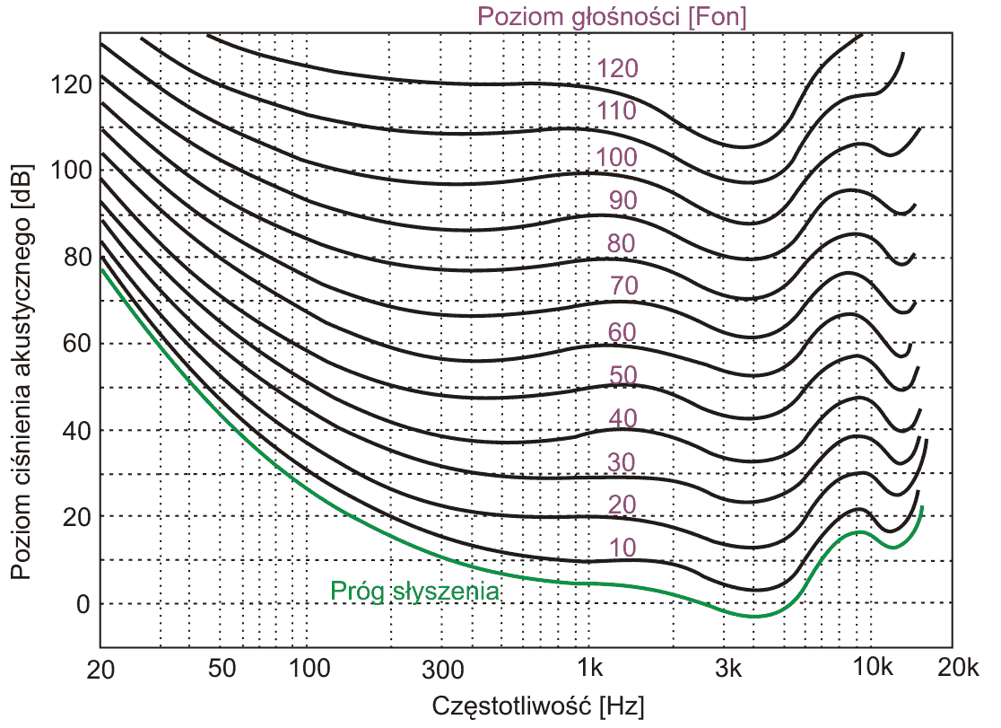 Wrażenie słuchowe wywołane dźwiękiem zależy od jego częstotliwości i poziomu ciśnienia akustycznego. Na Rys. 6 pokazano typowy zakres dźwięków słyszanych przez osoby o prawidłowym słuchu. Przedstawione na wykresie krzywe odpowiadają dźwiękom które postrzegane są jako mające tą samą głośność. Poziom głośności dźwięku wyrażany jest w fonach i jest liczbowo równy poziomowi ciśnienia akustycznego tonu o częstotliwości 1 kHz, który brzmi jednakowo głośno jak ten dźwięk.